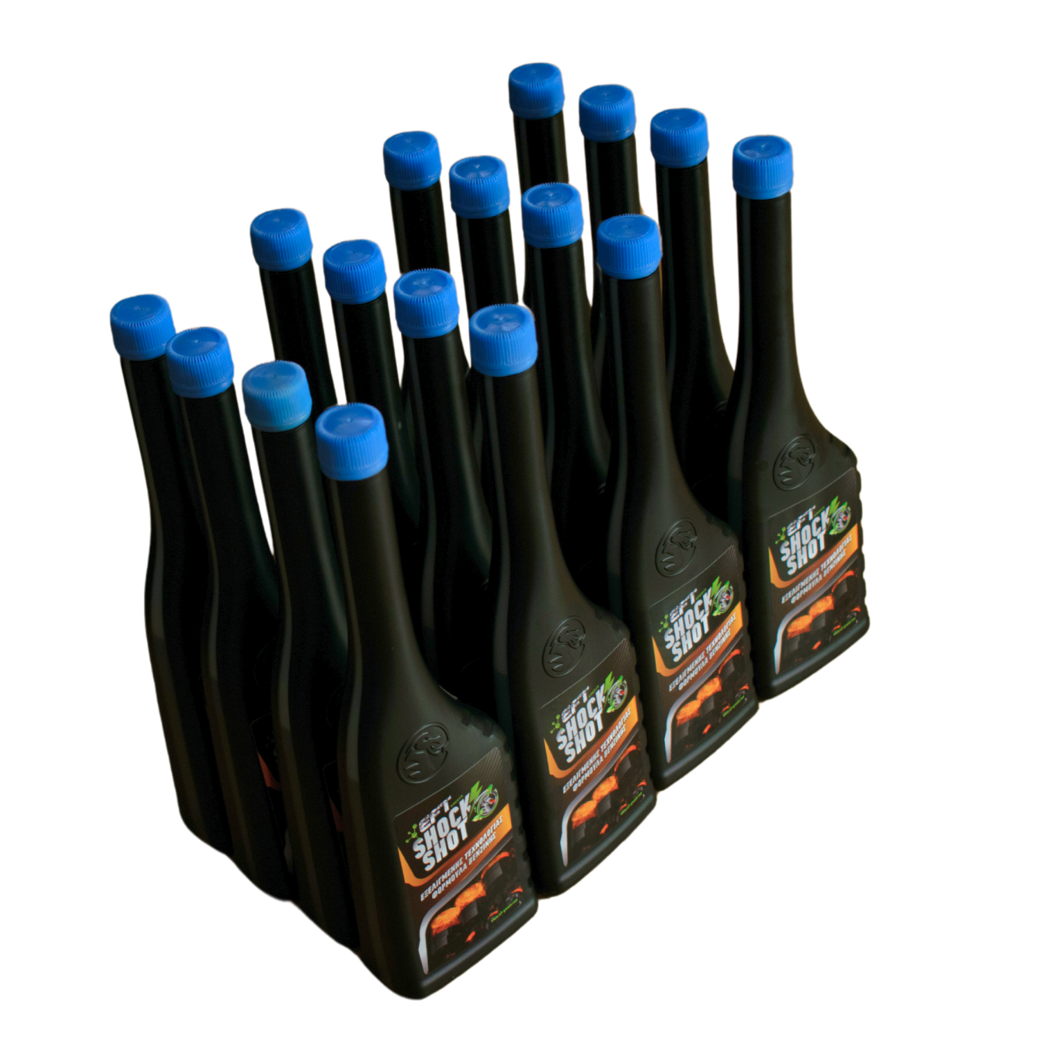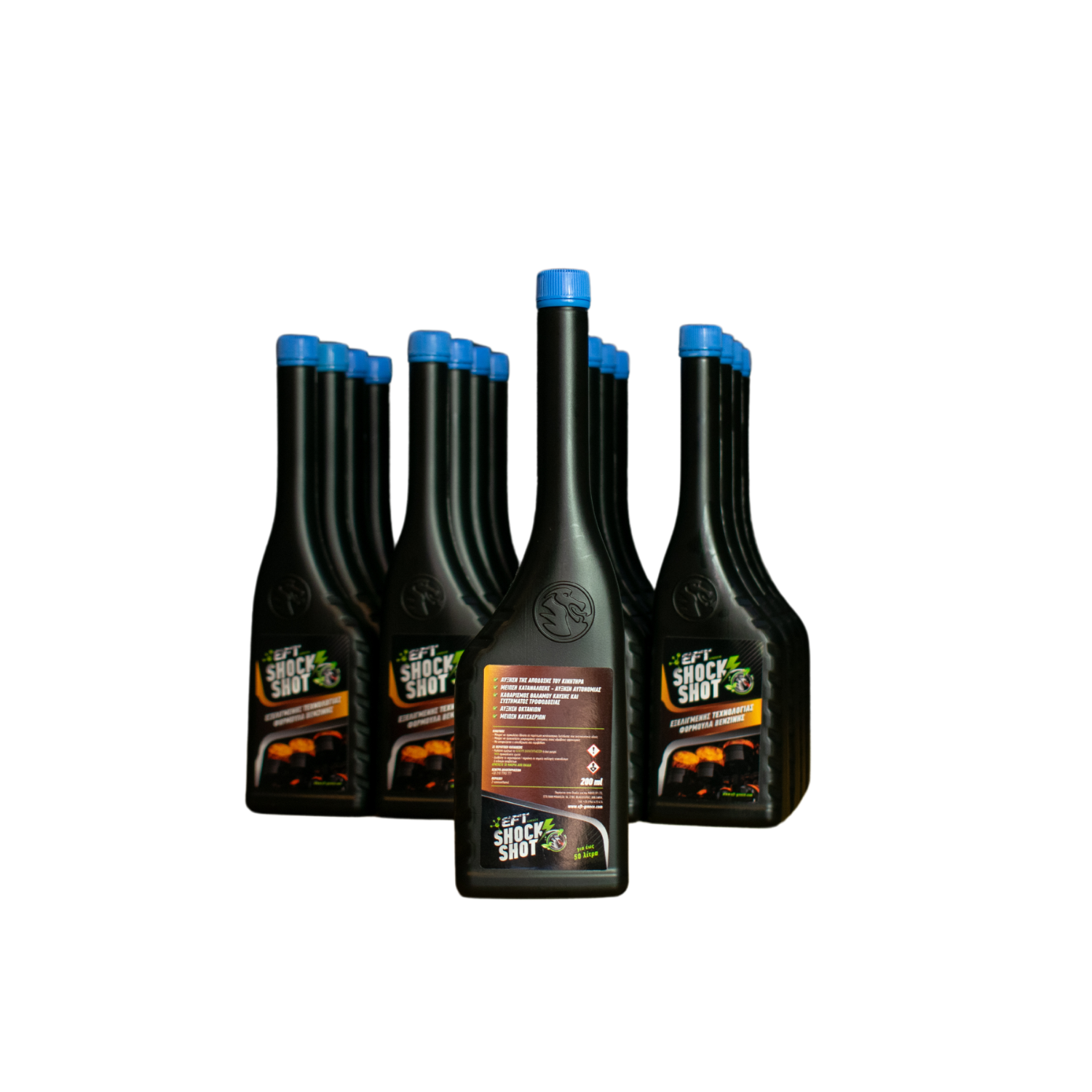 SHOCK SHOT (το μονοδοσικό Mega Shock 1250). Eίναι η απόλυτη βελτιωτική φόρμουλα καυσίμου για βενζινοκινητήρες, σχεδιασμένη για να αυξάνει την απόδοση, να βελτιώνει την οικονομία καυσίμου, να καθαρίζει το σύστημα τροφοδοσίας και να μειώνει τις επιβλαβείς εκπομπές καυσαερίων. Όπως όλα τα προϊόντα της EFT ετσι και το SHOCK SHOT  έχει ελεγχθεί και πιστοποιηθεί από την TÜV Thüringen για ελάχιστη εξοικονόμηση καυσίμου της τάξεως του 18%+.